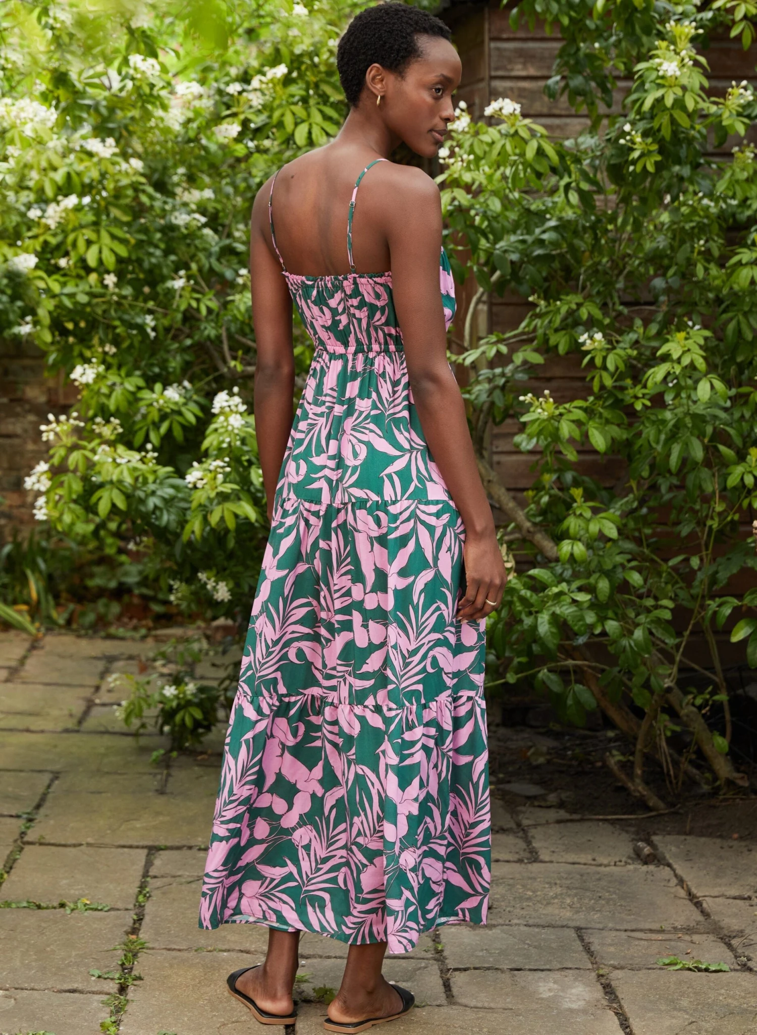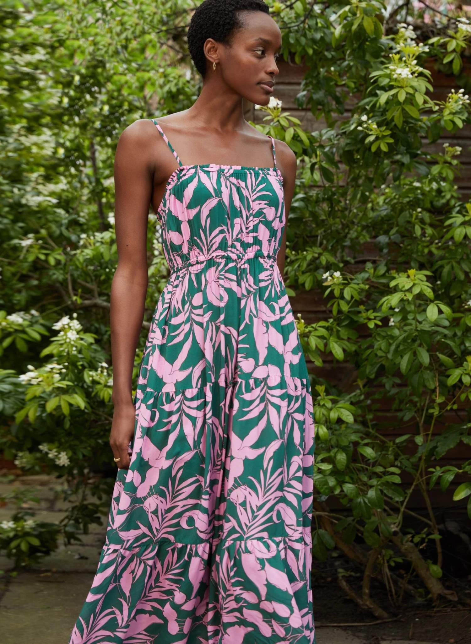 Whether you’re off to a garden party or simply need a new holiday dress, Anais delivers. Its striking pink frond print on a green base does all the hard work – just choose a bag and earrings. Cut from lightweight voile, this pretty style is elasticated around the neckline and waist for shape, before flowing out into a fluid, tiered skirt.