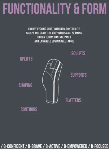 Reflexone’s Luxury cycling short with new contour fit. The B-confident range sculpts and shapes the body with smart seaming and a hidden tummy control panel, ensuring maximum comfort and a flattering fit.