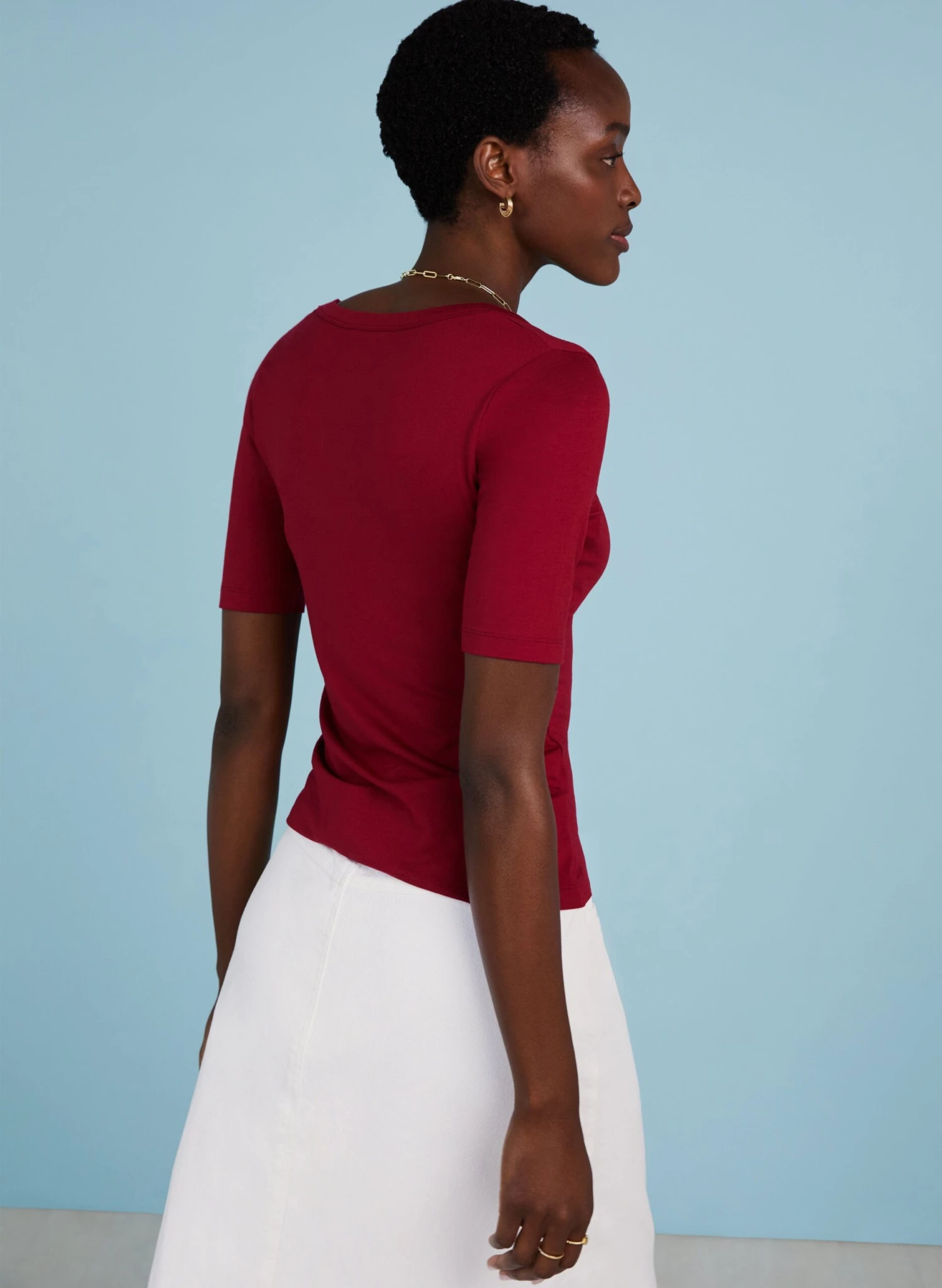 New to the family of wardrobe basics is this considered top. Cut with a generous scoop neckline and fitted sleeves, this is a neat, feminine twist on a classic tee. Made from planet-conscious jersey fabric – LENZING™ ECOVERO™ – and with just the right amount of stretch, it’s a staple your jeans and chinos will love.