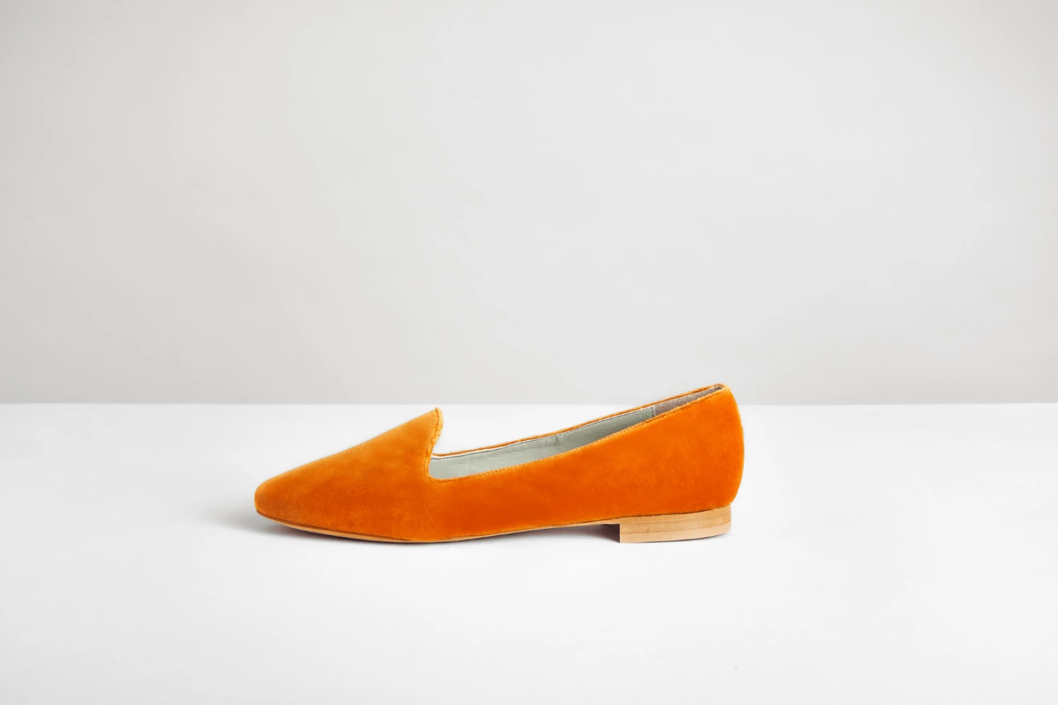Slippers in orange “Zucca” Velvet from Italy – inspired by the Venetian slipper.Â