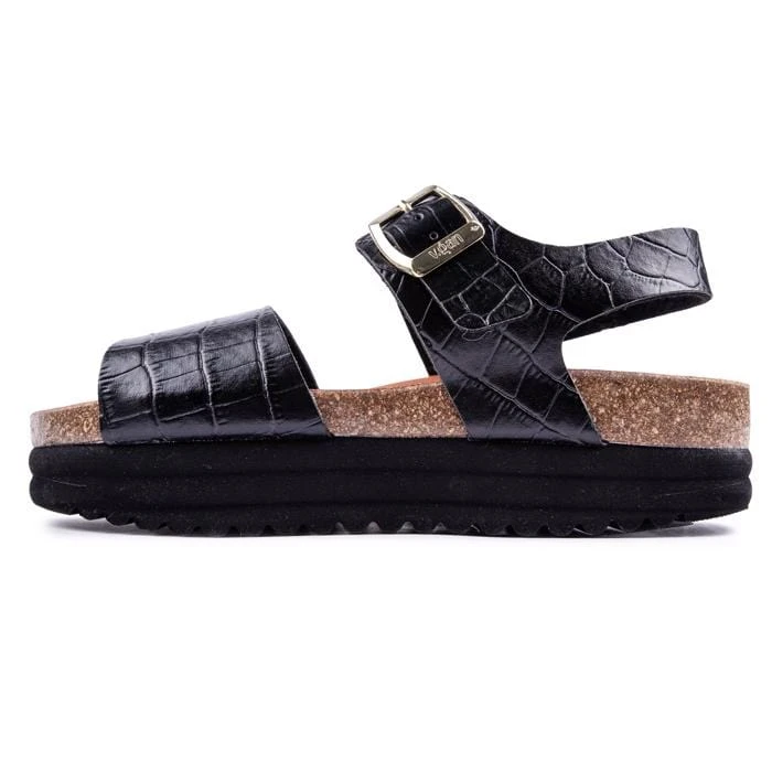 Put your best foot fashionably forward with V.GAN style Clove women’s sandal. These black patent sandals boast functional buckles and a comfortable moulded flatform.