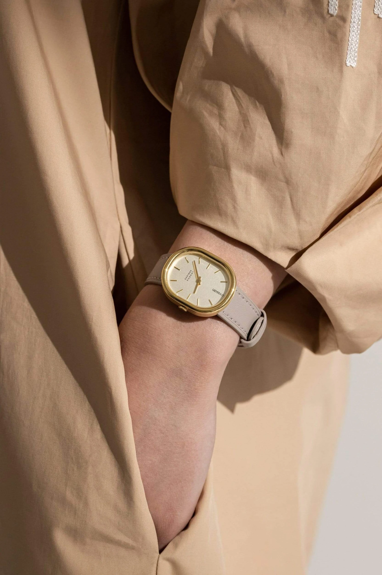 More beauty lies in the minute details; there’s a tiny engraved heart on the crown, a delicate screw detail on the side of the case, and a special engraved message on the case back. The interchangeable sand-coloured Cyssan strap is made from vegan leather that’s fastened with a unique, gold curved buckle, and embellished with a mini bejewelled ring – for that extra dose of glamour!