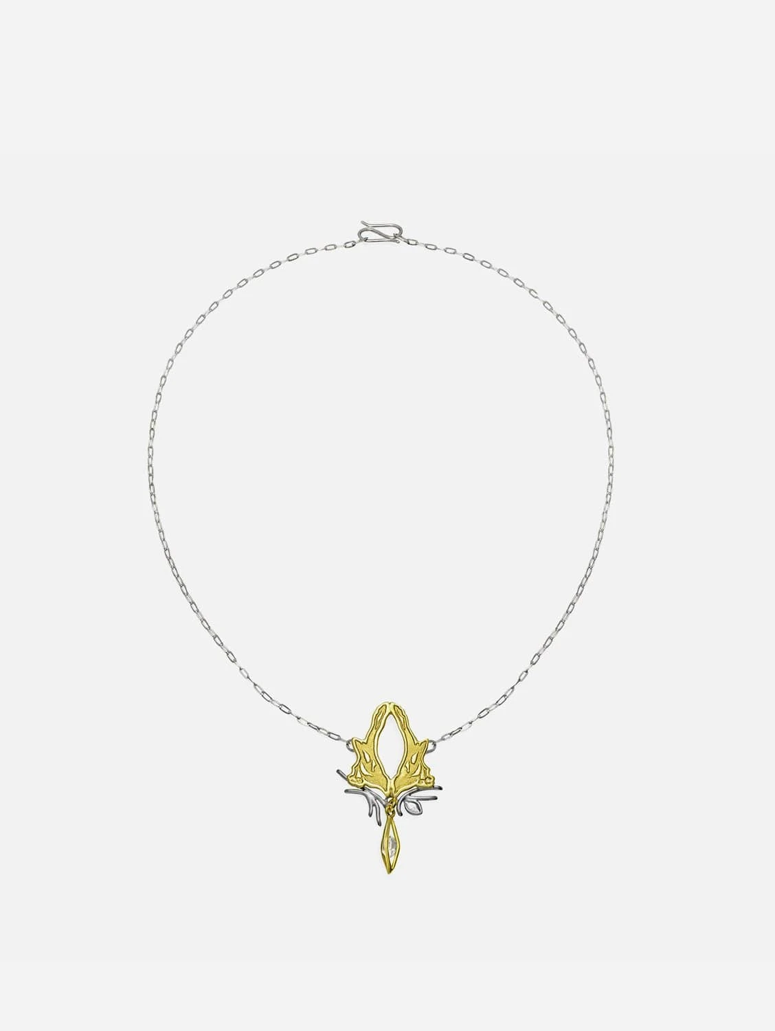 Exhibiting subtle contrasting areas of satin relief and high polish whilst illustrating a line from the folkloric fortune telling rhyme of the magpie, the necklace depicts the iconic ‘Two for Joy’ birds perched on recycled silver branches clasping a Herkimer Diamond Quartz Drop. Couple with a pair of hand-stamped Fairtrade Gold Leaf Studs for a day to day effortless look celebrating unity and love between two free spirited wild beings.