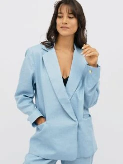 This Havana clean-lined linen oversized blazer jacket is designed with a simple straight fit, a notch collar and double-breasted structure, creating a cutting edge style. If opting for a tighter fit, simply go down a size.