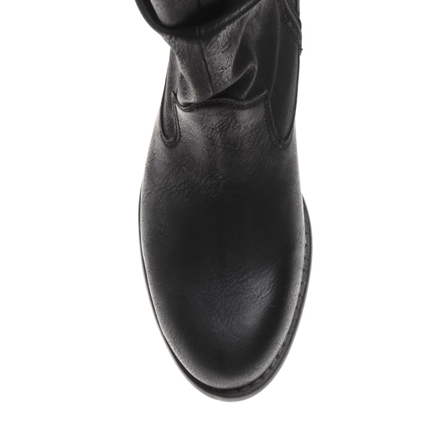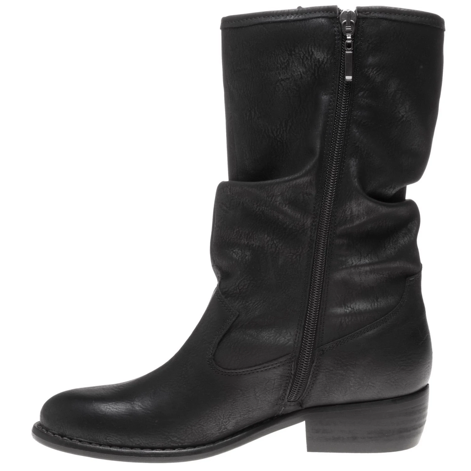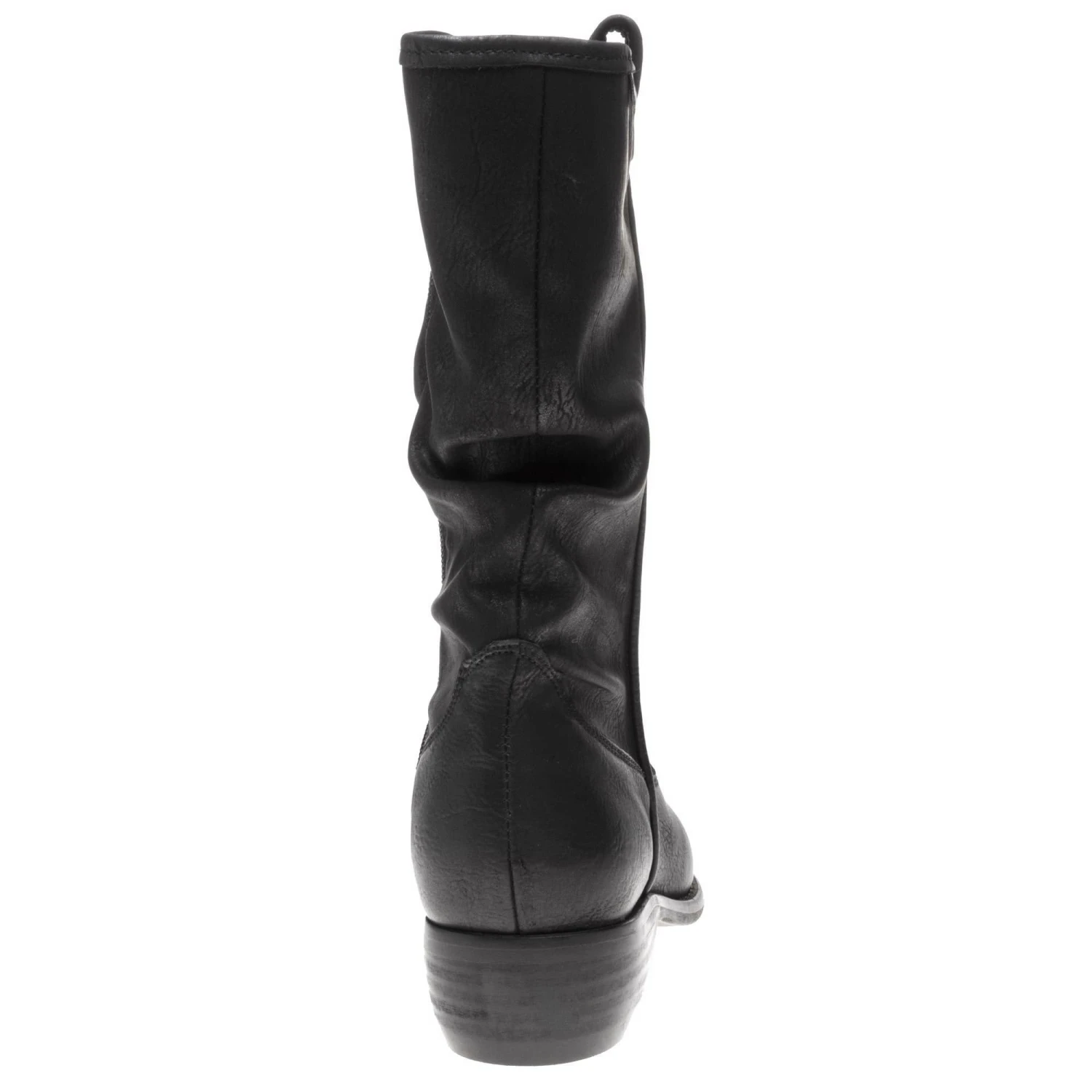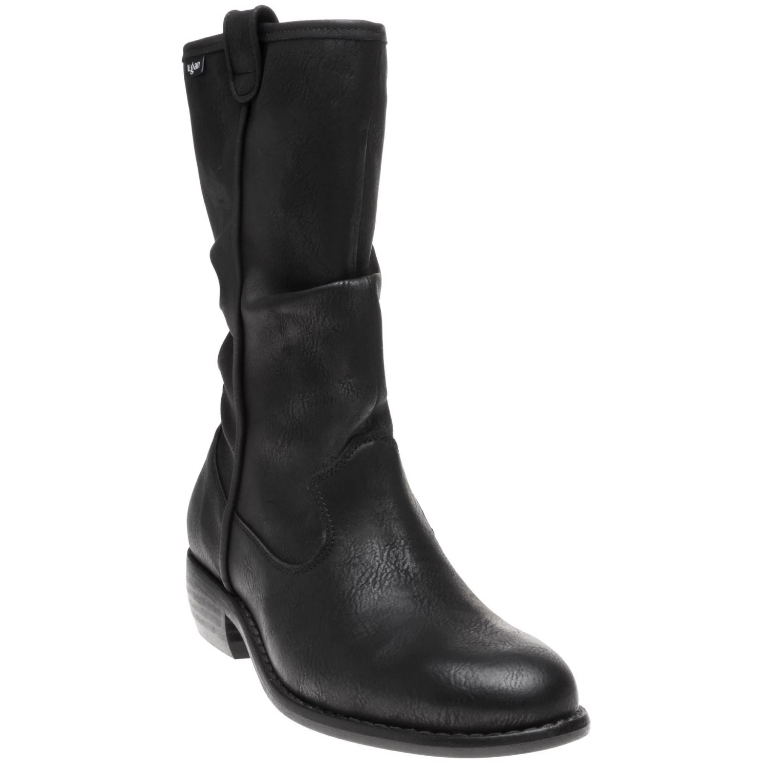 Enjoy fashion with a conscience with this cowboy-styled black mid-calf ruched boot. Beautifully finished with subtle branding details. Free of animal products and is PETA approved and is made in a vegan-certified factory.