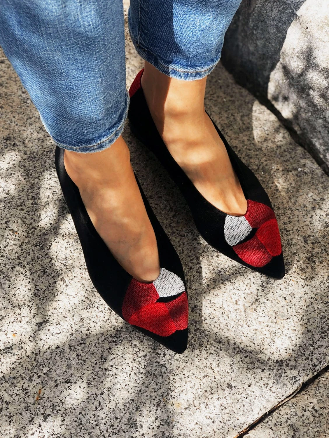Fun embroidery on velvet. Vegan, sustainable, comfortable, and original! What more could you want? Original and feminine ballerinas, perfect to brighten up your day.