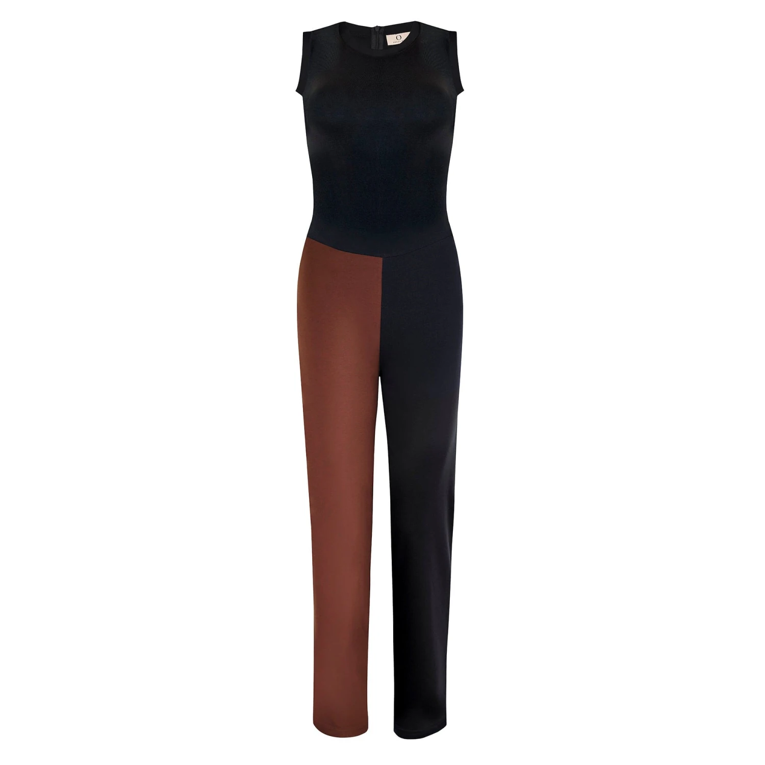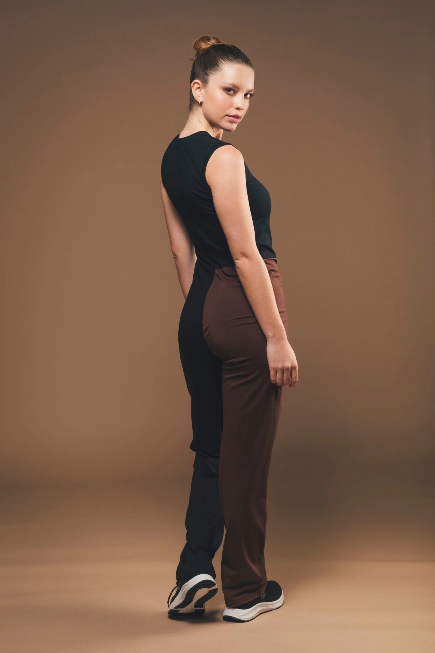 A sustainable fashion staple, this straight leg jumpsuit in block black and brown is a perfect addition of work out clothing to your capsule wardrobe. As sustainable clothing meets women’s activewear, this jumpsuit provides a classic athleisure silhouette that will support movement and activity. GOTS certified Organic Cotton stretch jersey seamlessly hugs the body for a comfortable fit.