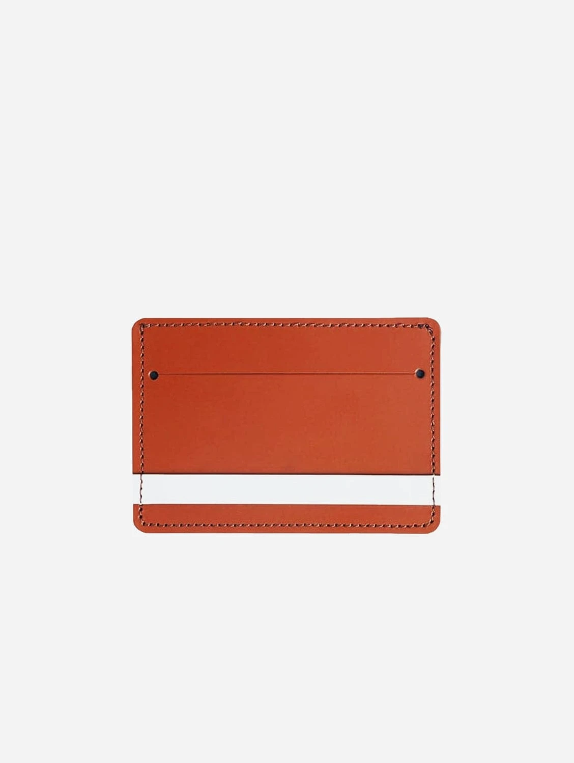 The Paris card holder features a contrasting stripe front accent with three card slots. Handcrafted with recycled vegan material.
