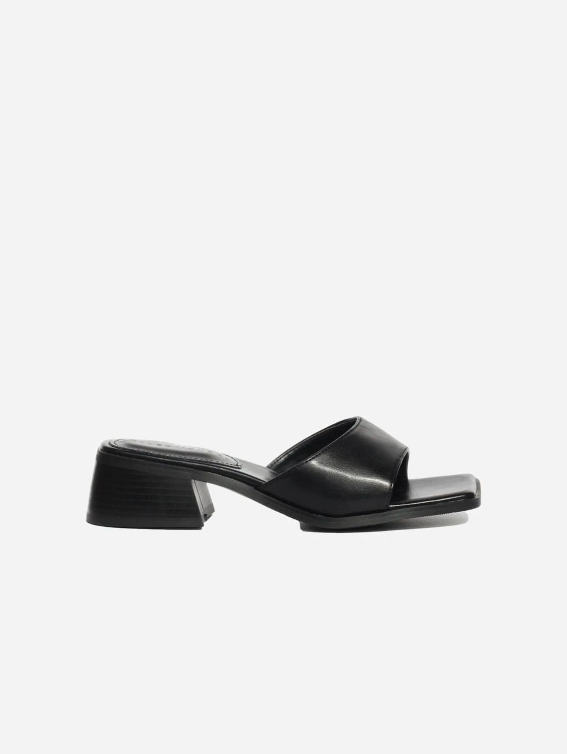 The Pia black vegan leather sandals are set on a 5 cm wooden effect block heel and designed with a cushioned insole for extra comfort. Featuring a square toe to create a stylish and refined shape, perfect for everyday wear.