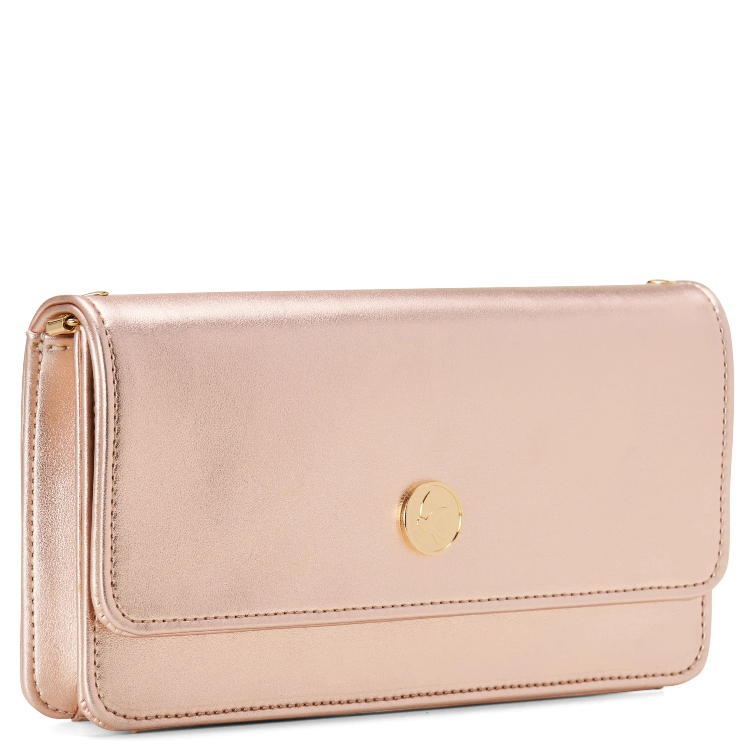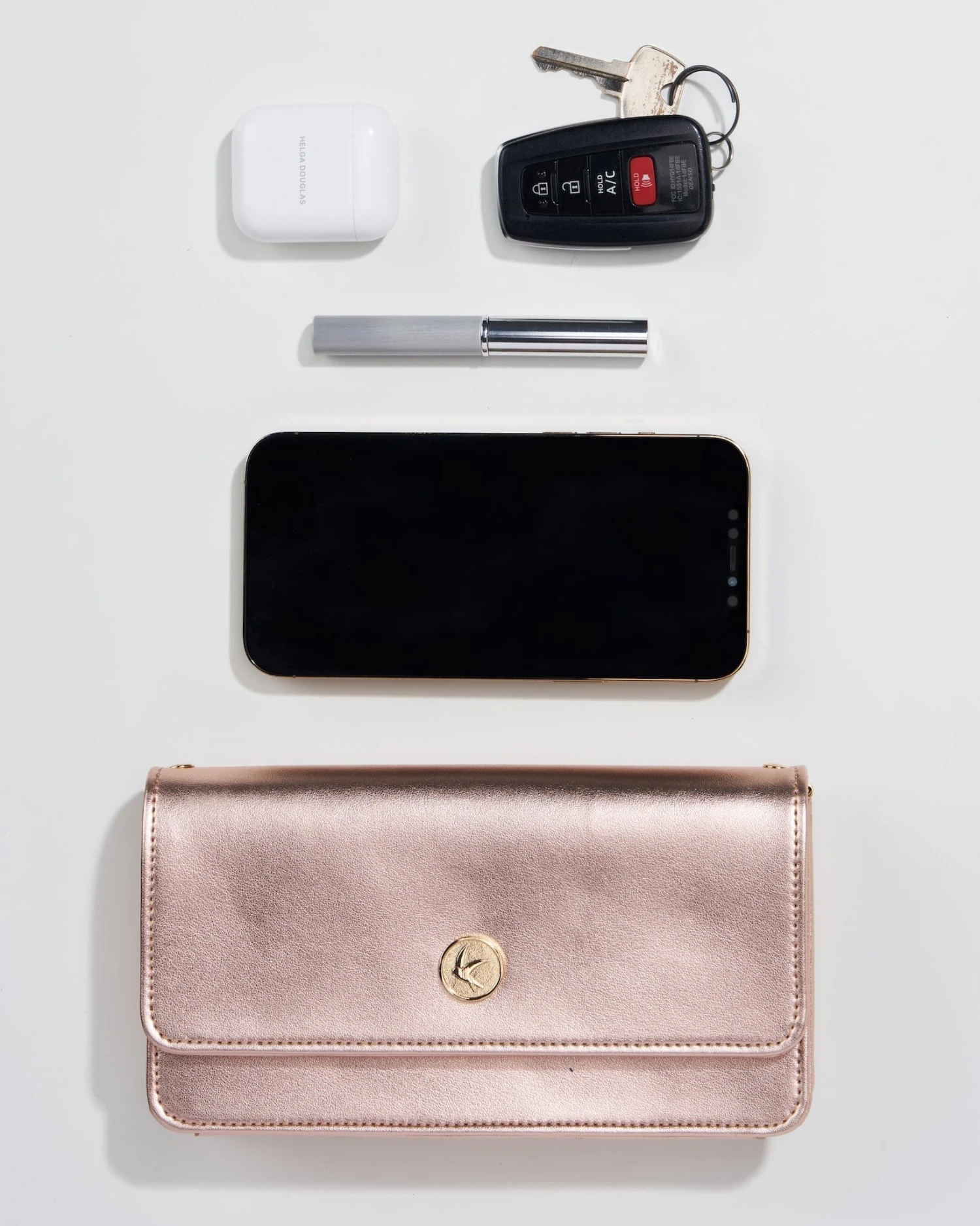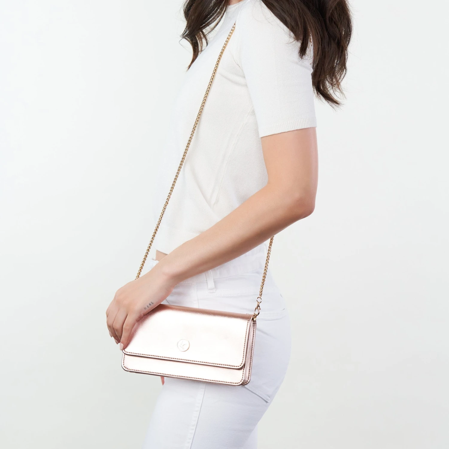 The Sara wallet purse is perfect for the girl on the go. This vegan wallet is great for daily use and doubles as a purse – just add the detachable gold chain or crossbody strap. This convertible wallet is handcrafted from rose gold Bioveg.