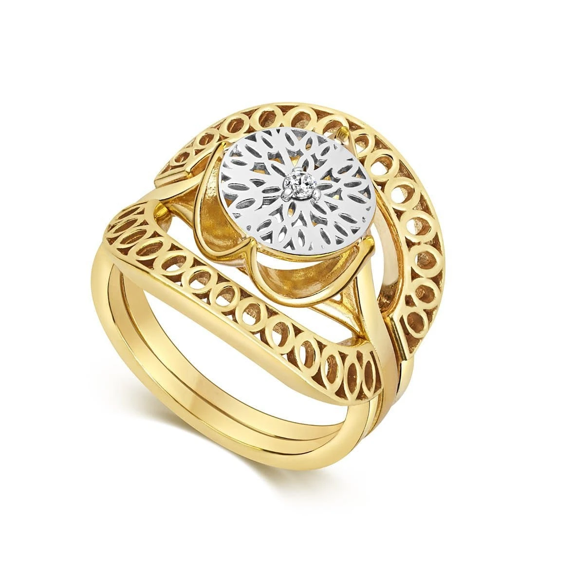 This cocktail ring, takes a signature slice of the Andalusian orange – found in the Seville collection – and sets it upon a crown setting. Inspired by a ring given to Annabel by her grandmother, the four semi-circular parts that make up the crown setting reflect both light and glamour bringing the Spanish sunshine alive. The silver top set with Cubic Zirconia, an alternative man-made, ethical and flawless stone adds sparkle to the design. This ring can be worn as a stand-alone ring or worn alongside the Crescent Ring.