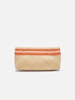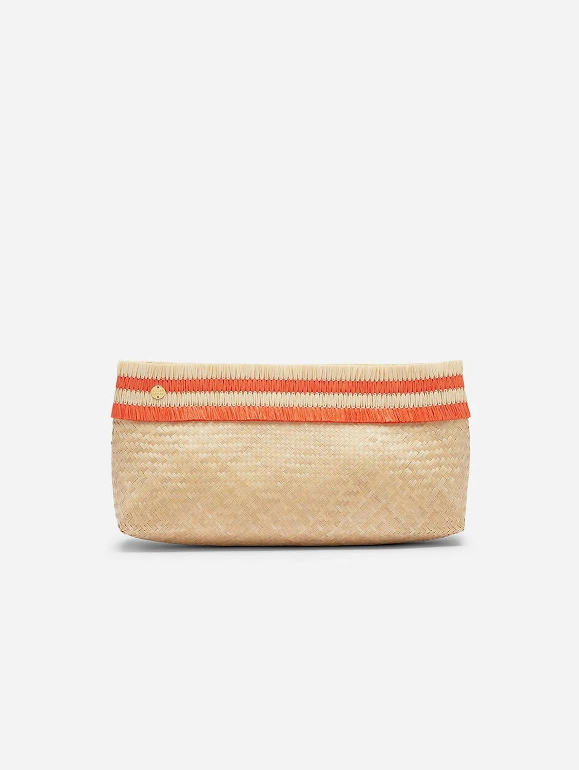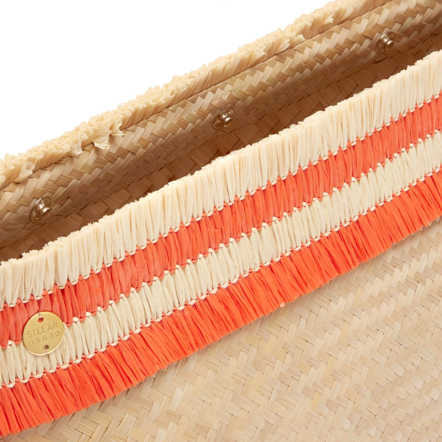 Handwoven with locally grown organic bamboo, it features a two-tone hot coral raffia trim. It is offset with yellow gold tone hardware.