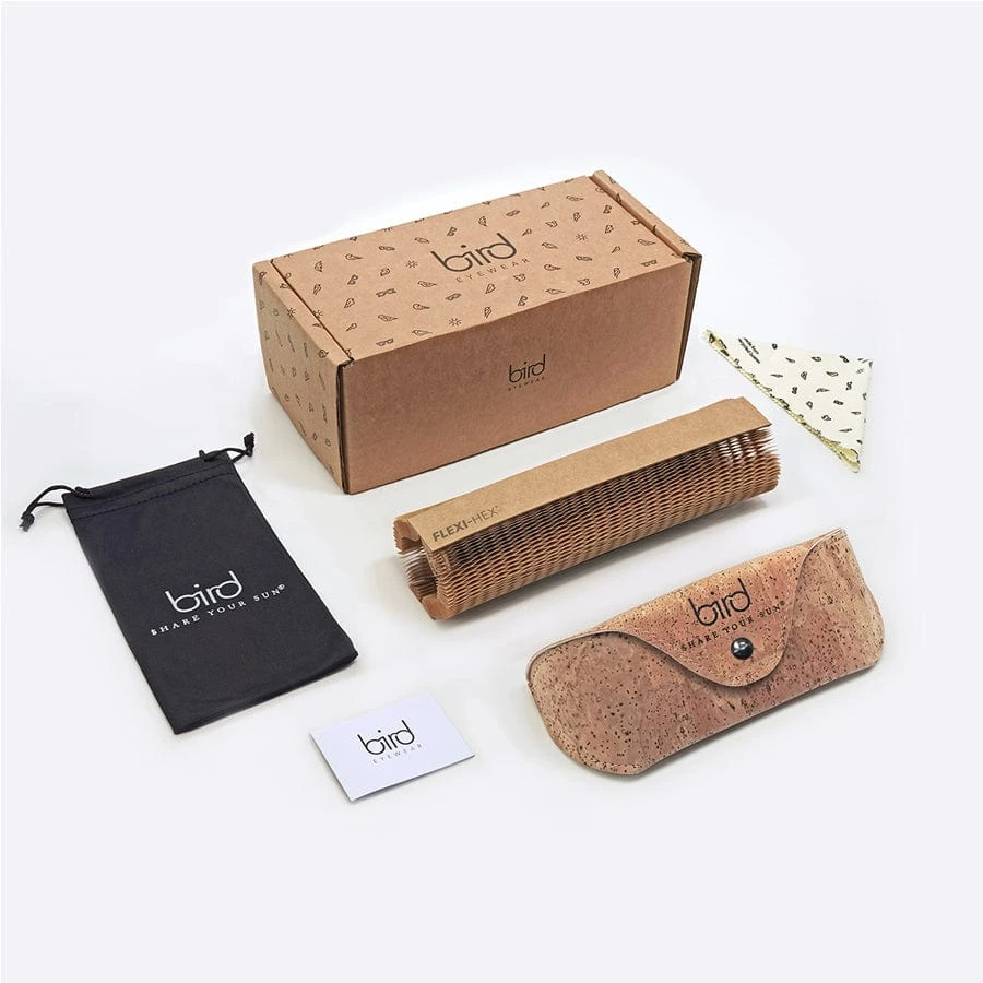 All frames include a handmade eco-cork case and a Share Your Sun cleaning cloth, packaged with recycled, sustainable and compostable packaging. Â