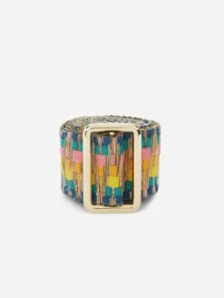 This striking jacquard belt focuses on traditional weaving techniques and is meticulously crafted from hand-washable cotton in navy and lime with a light yellow gold tone buckle.