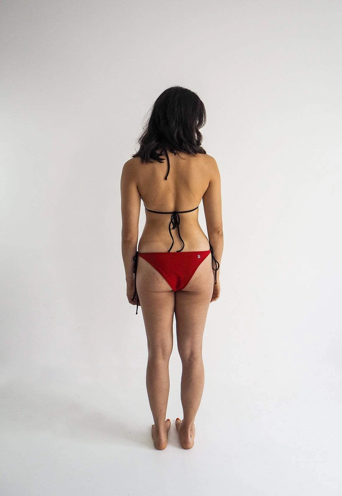 The bottom is a string triangle shape with coverage being small to mid so is perfect for those sun dwellers yet still practical for those dips in the ocean. It’s super comfortable and easy to adjust. Excellent for minimal tan lines. The string is super long and can be cut to desired length once fitted.