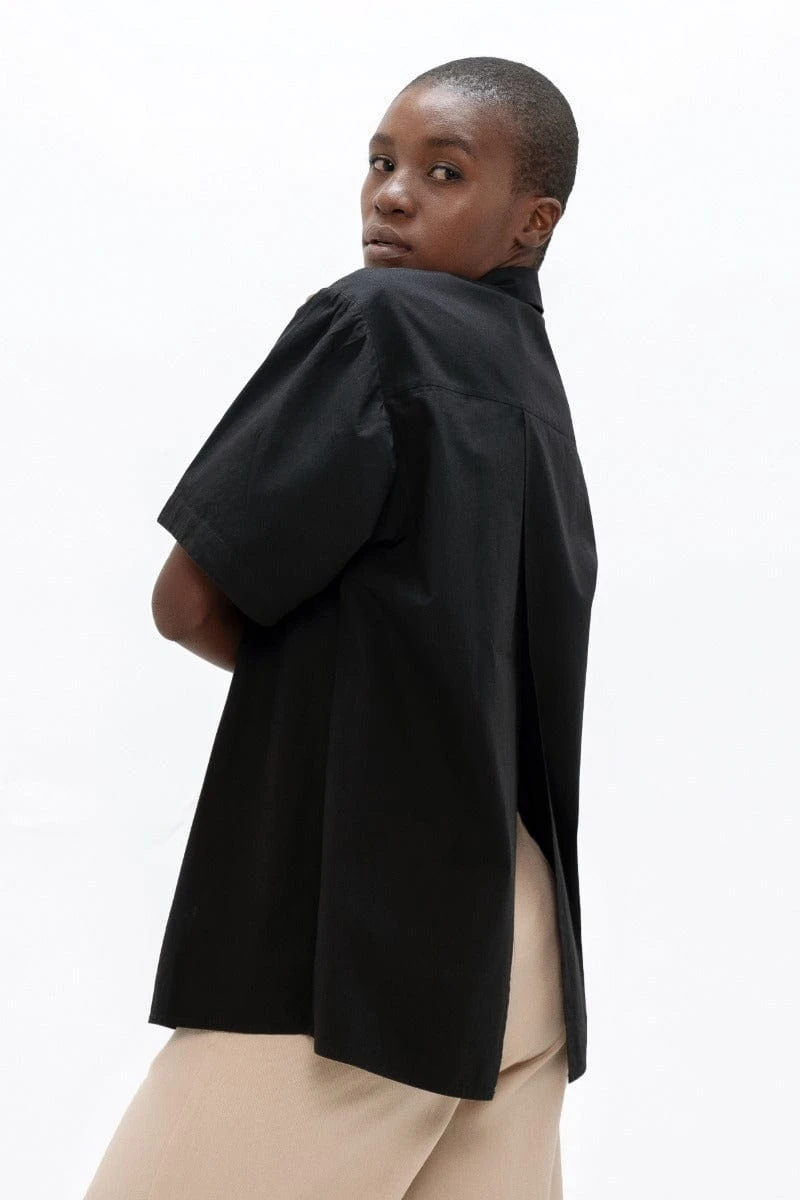 1 People’s short-sleeved cotton shirts are a timeless essential in any capsule wardrobe; ideal for Zoom calls, office meetings and even weekends in the town. The blouse features a revisited blouson sleeve and kent collar the epitome of smart casual. The long crop straight cut allows you to tuck into high-waisted pants or denim pieces with ease to perfect the chic look.